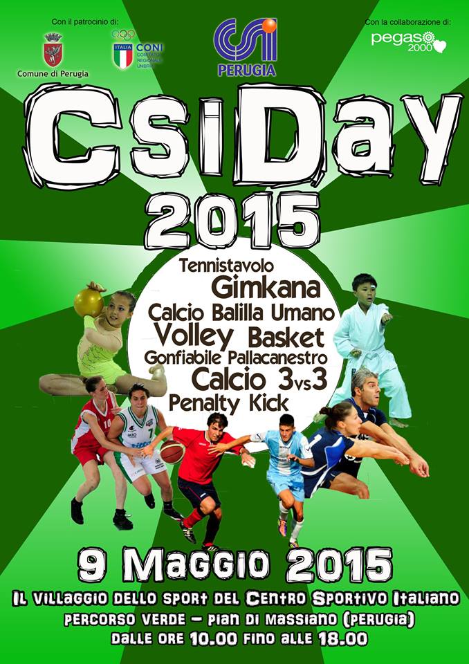 Dopo il grande successo della scorsa edizione, Sabato 9 Maggio 2015, in tantissime località d’Italia, il CSI "scenderà in piazza", in contemporanea e grazie all’impegno di tantissimi Comitati, Dirigenti, Allenatori, Arbitri, Atleti. Il Csi Day è l’occasione di unire tutti quei luoghi, quelle persone, quelle testimonianze, in un abbraccio, che collega simbolicamente tutta l’Associazione, da Nord a Sud. In particolare il comitato di Perugia organizzerà per Sabato 9 maggio un Villaggio dello Sport nell’area del Percorso Verde di Piano di Massiano, dove saranno presenti gonfiabili e campi mobili per permettere a tutti di vivere una giornata di sport e divertimento. In particolar modo utilizzeremo i campi da Basket, la Pista Ciclabile e le aree verdi limitrofe per l’organizzazione di questo grande evento aperto a tutta la cittadinanza. L’obiettivo è quello di riempire una delle più importanti aree sportive della città di bambini e ragazzi che durante tutta la giornata avranno a disposizione gli impianti per giocare e divertirsi. Saranno presenti vari impianti Mobili dove i nostri animatori faranno divertire grandi e piccoli.
